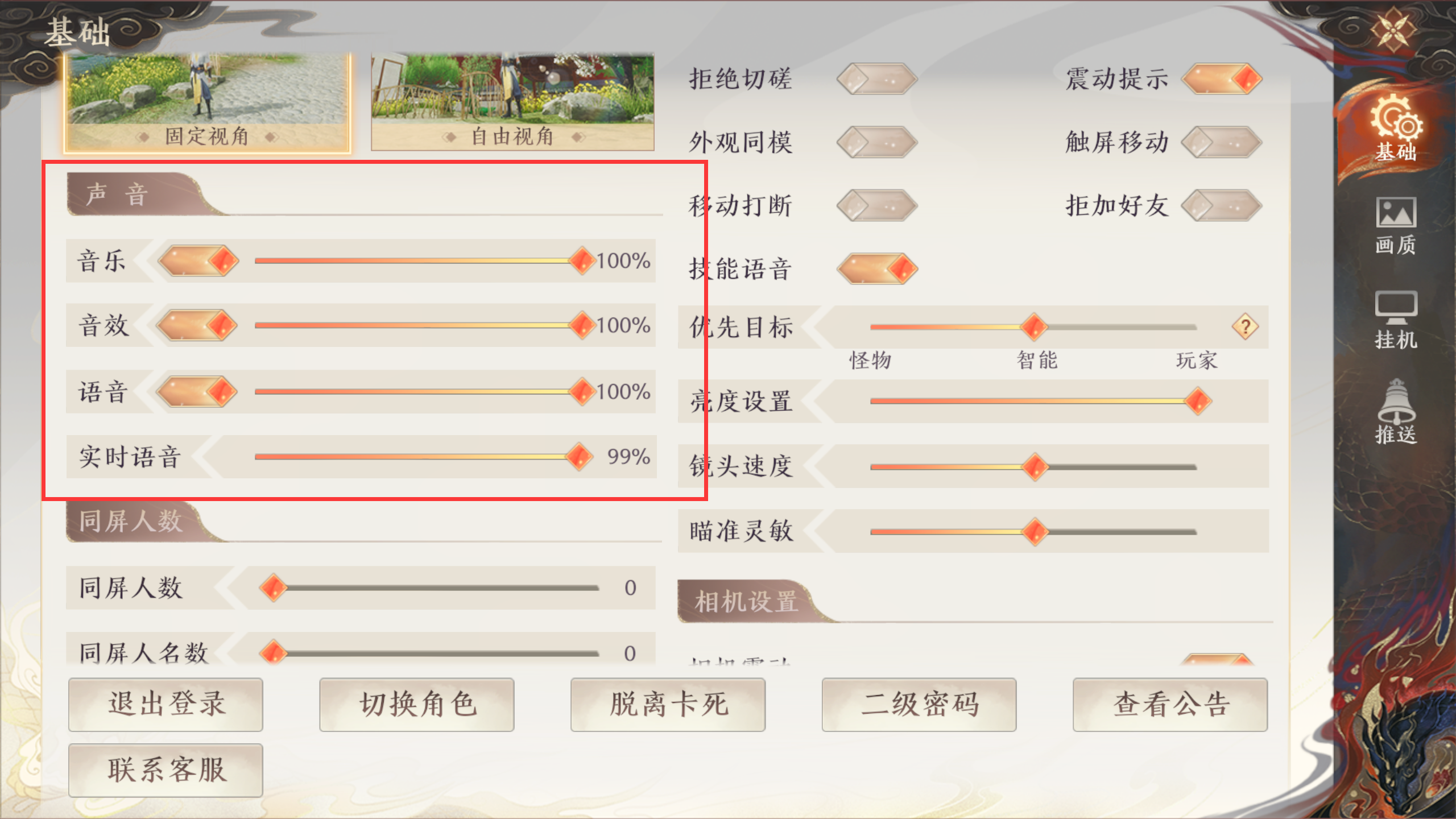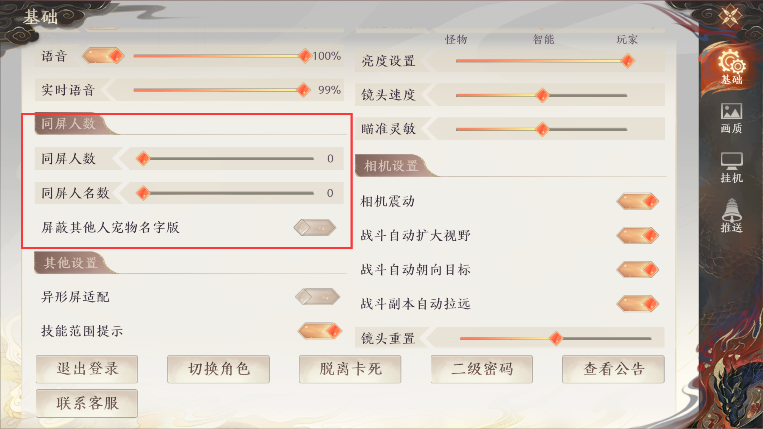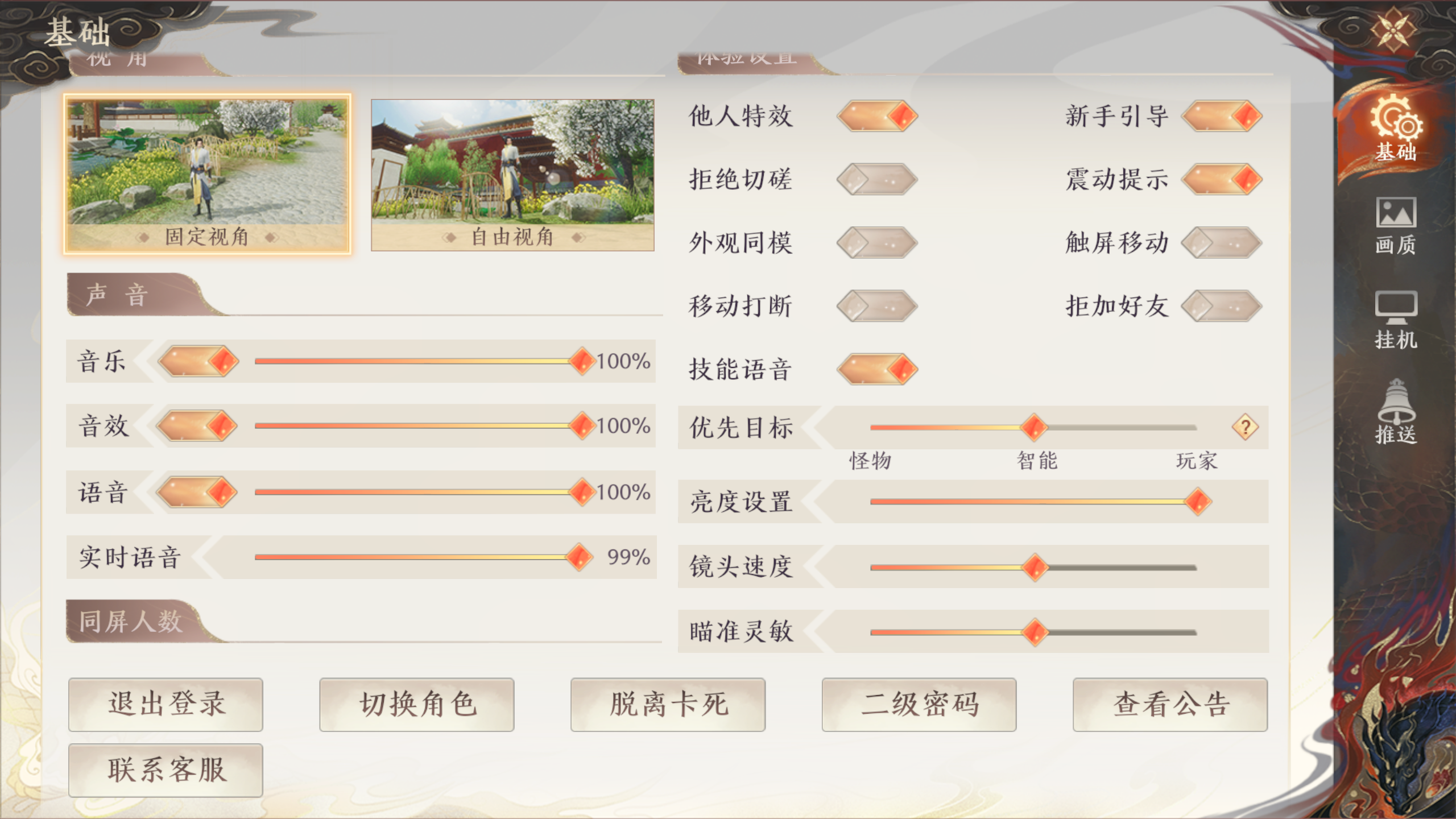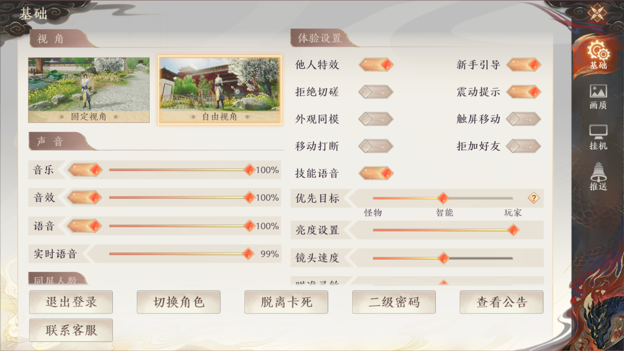 在基础设置界面,少侠可以详细设置视角、声音、同屏人数、体验设置、相机设置等设置。还可以注销、切换角色、出卡、二级密码、查看公告、联系客服等。