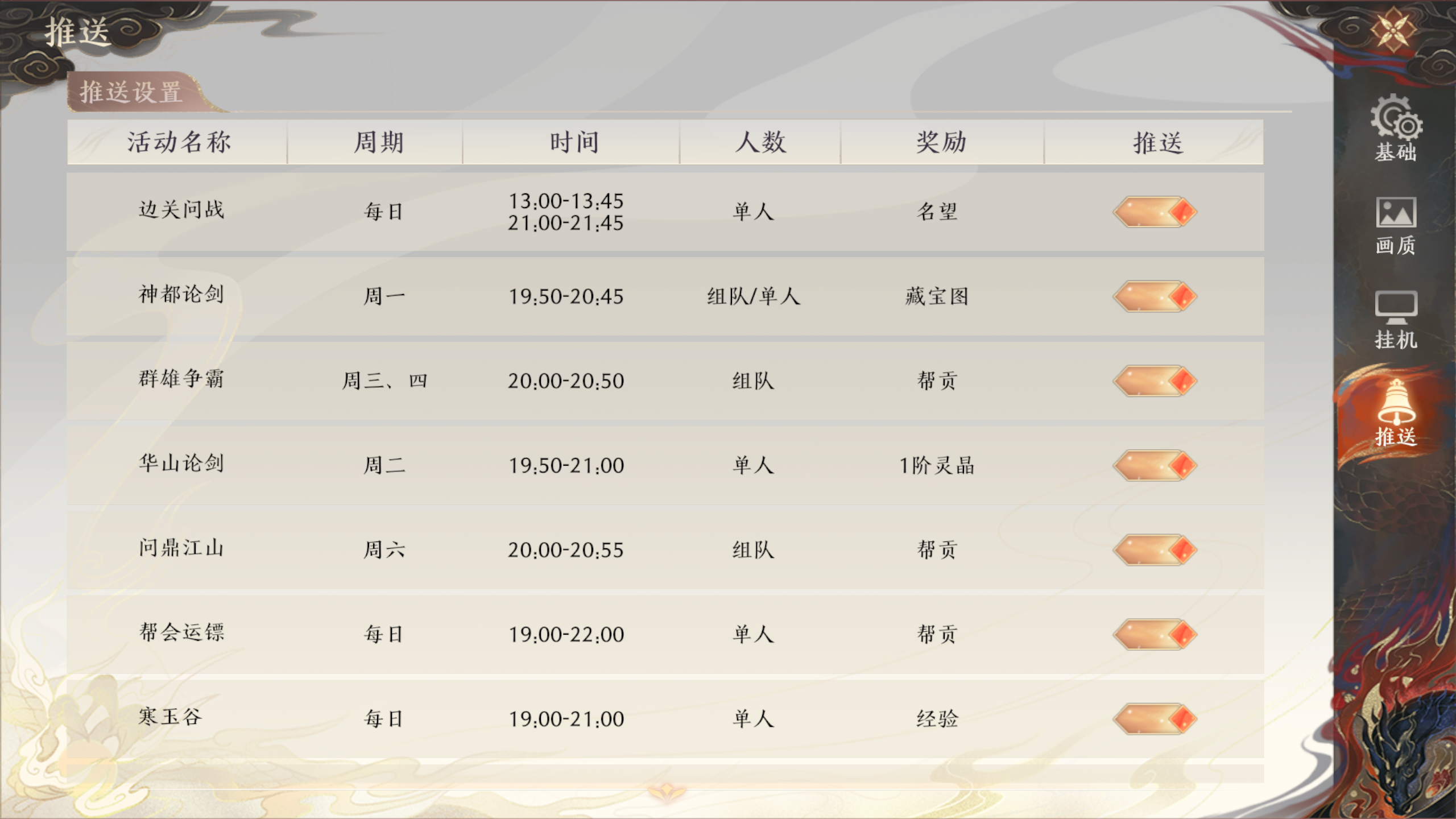 推送功能界面可以查看时间、周期、人数、奖励等。建议推送可能错过的活动,关闭不会错过的活动。