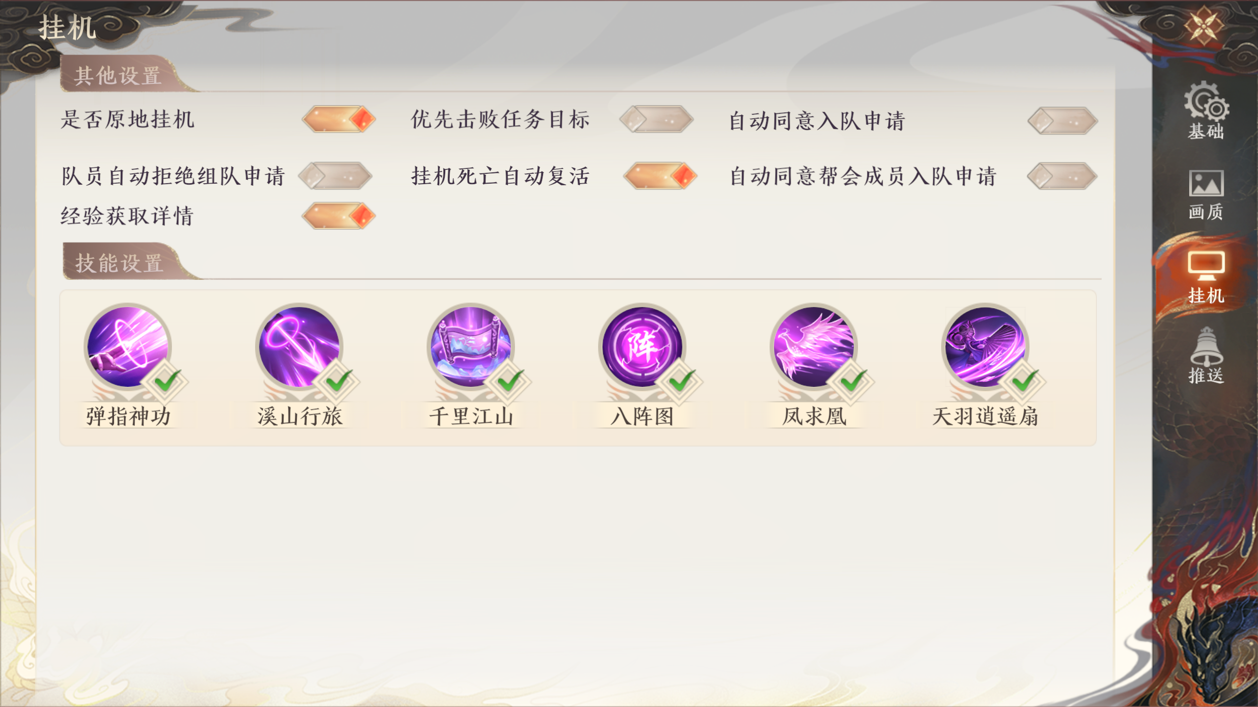 挂机设置也是实用功能,比如是否挂机到位,优先击败任务目标,自动同意组队等。都很实用,可以根据自己的需求来设置。