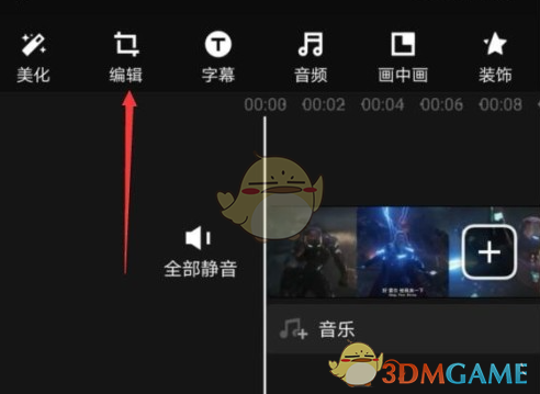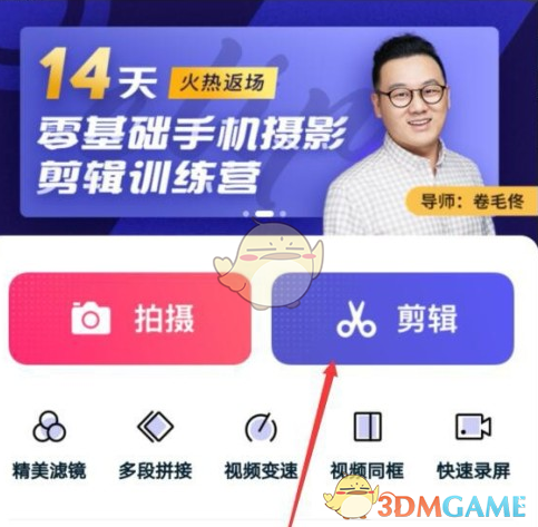 1。打开手机里的[/[k0/]] app,按照下图箭头指示的方向点击[剪辑]。